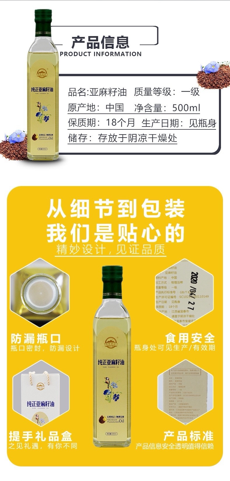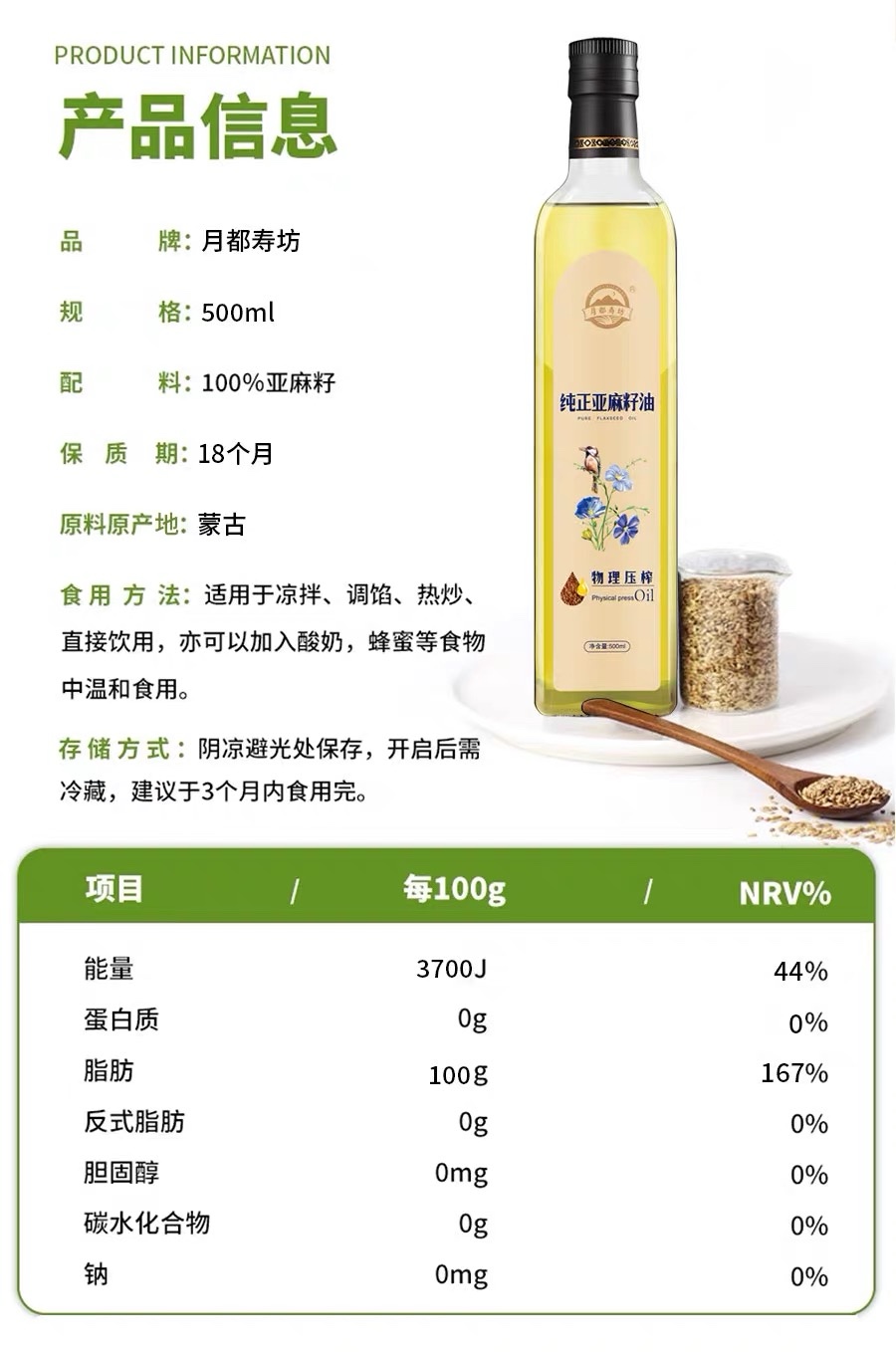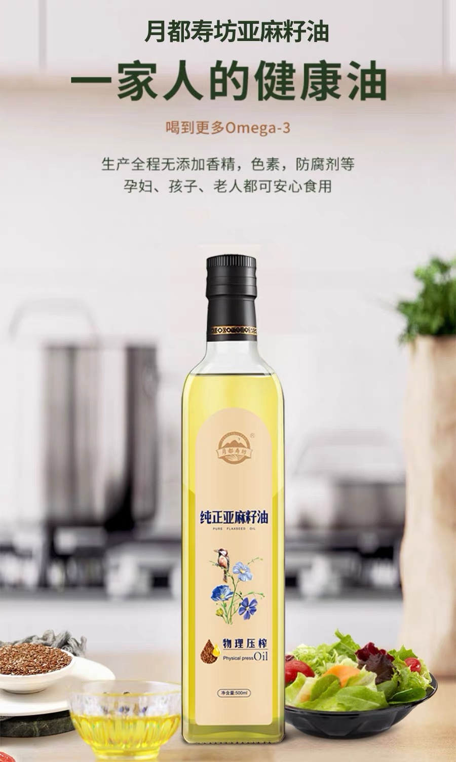 月都寿坊高omega3纯正亚麻籽油一级冷榨500ML*20瓶
