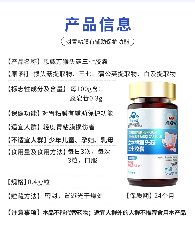 恩威万®之本牌猴头菇三七胶囊【30粒】3瓶装